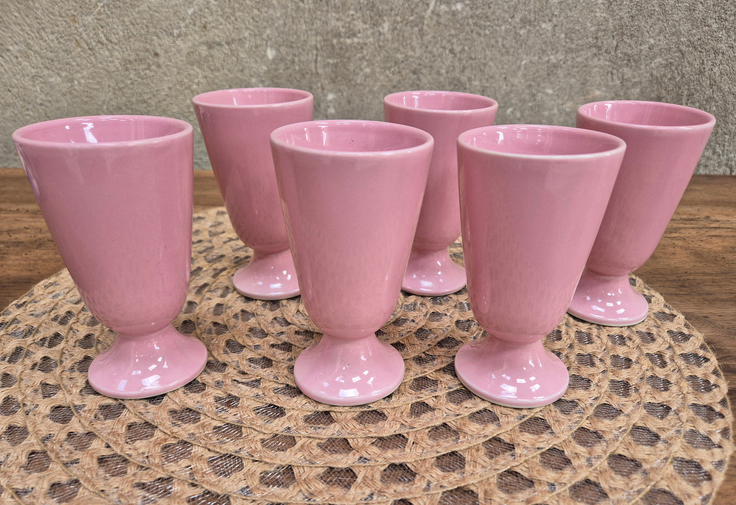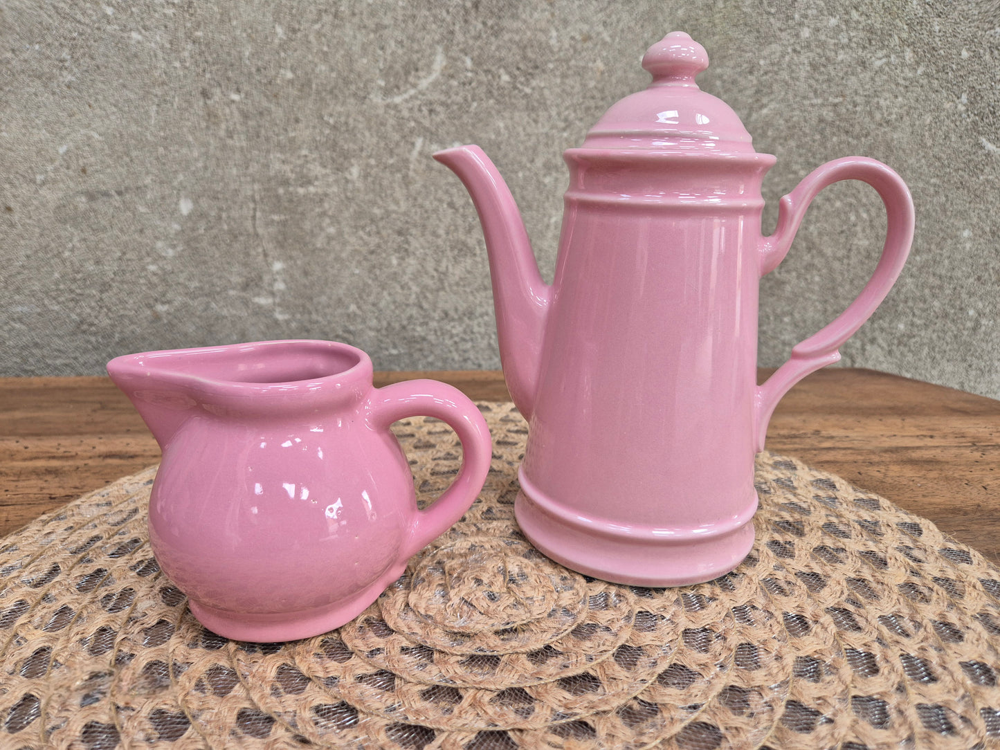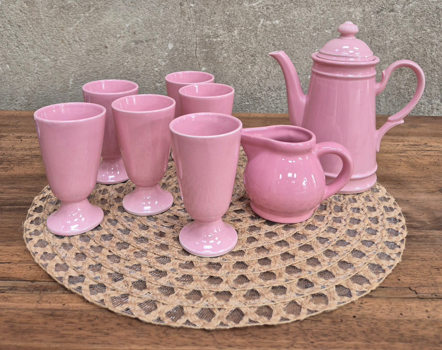Service à café rose pastel comprenant une cafetière, son pot à lait et les six mazagrans.