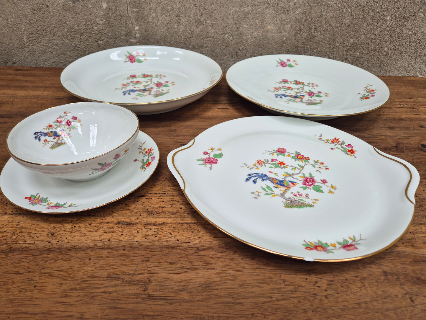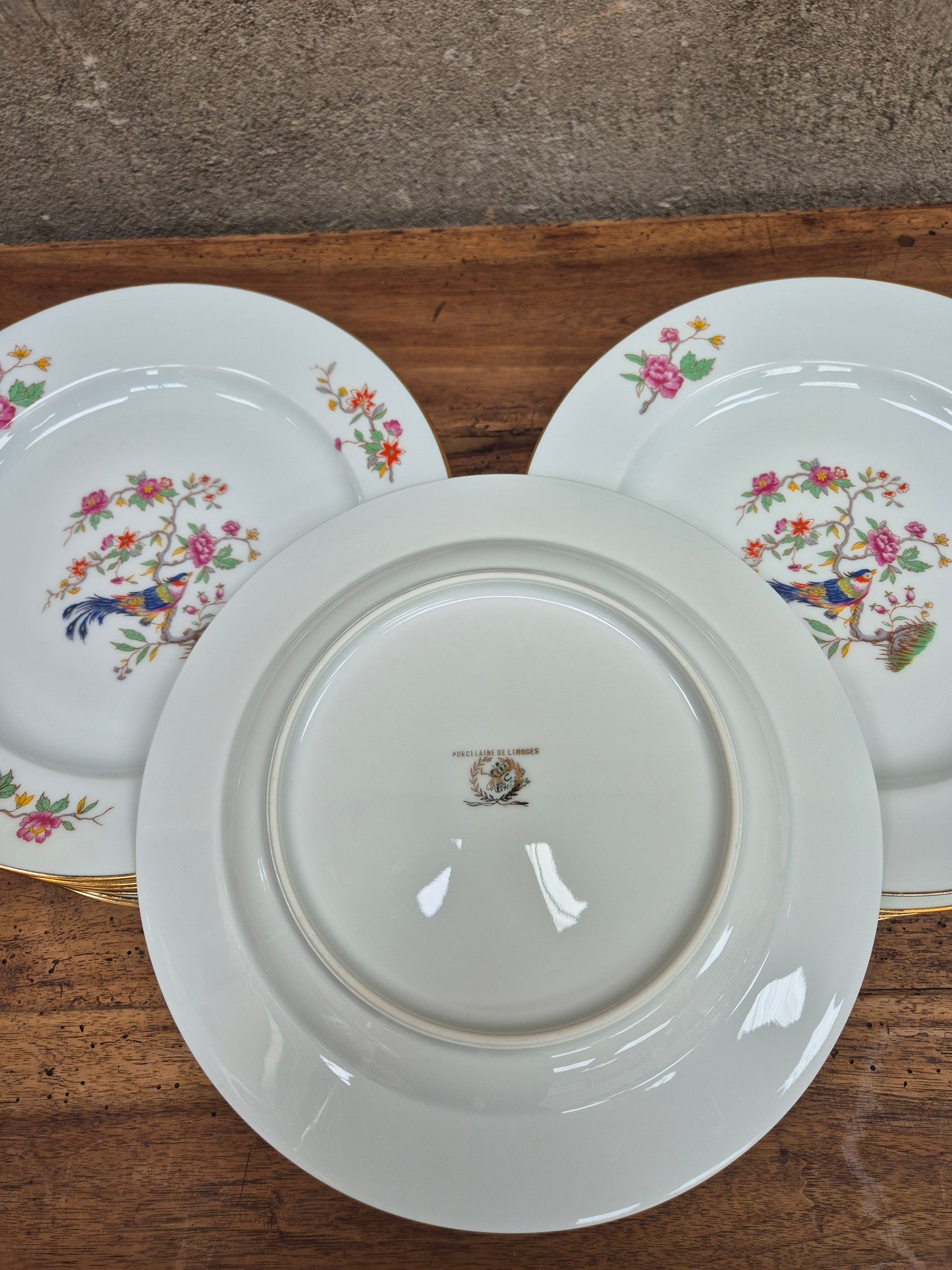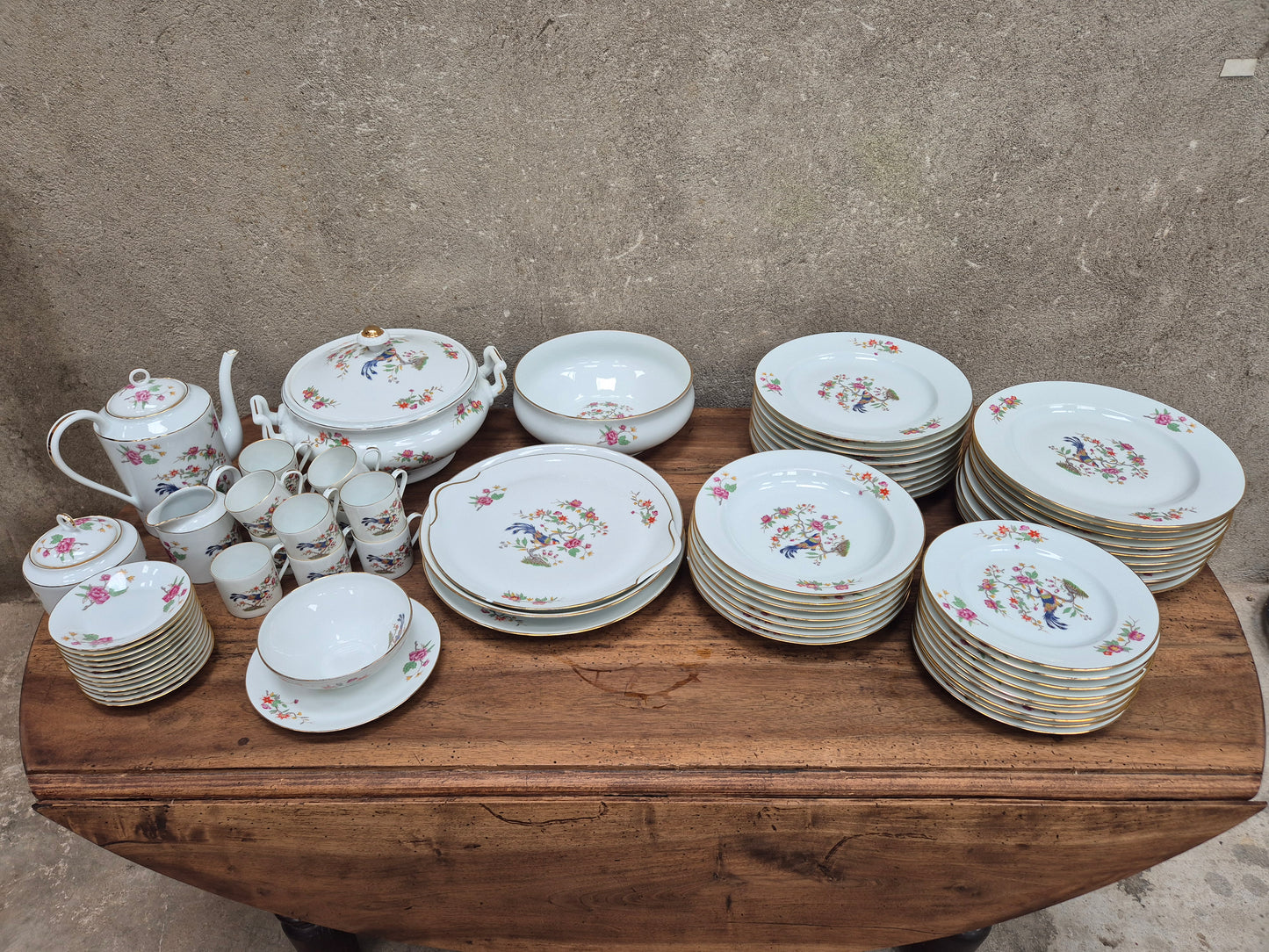 Service de table en porcelaine de Limoges avec un décor fleuri, oiseau bleu et liseré doré.