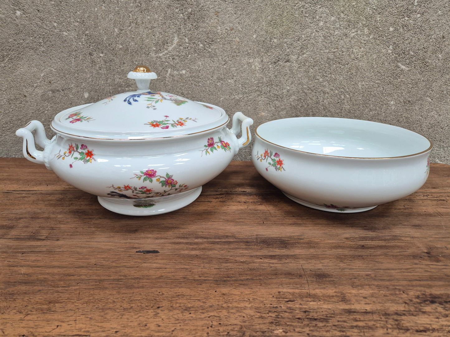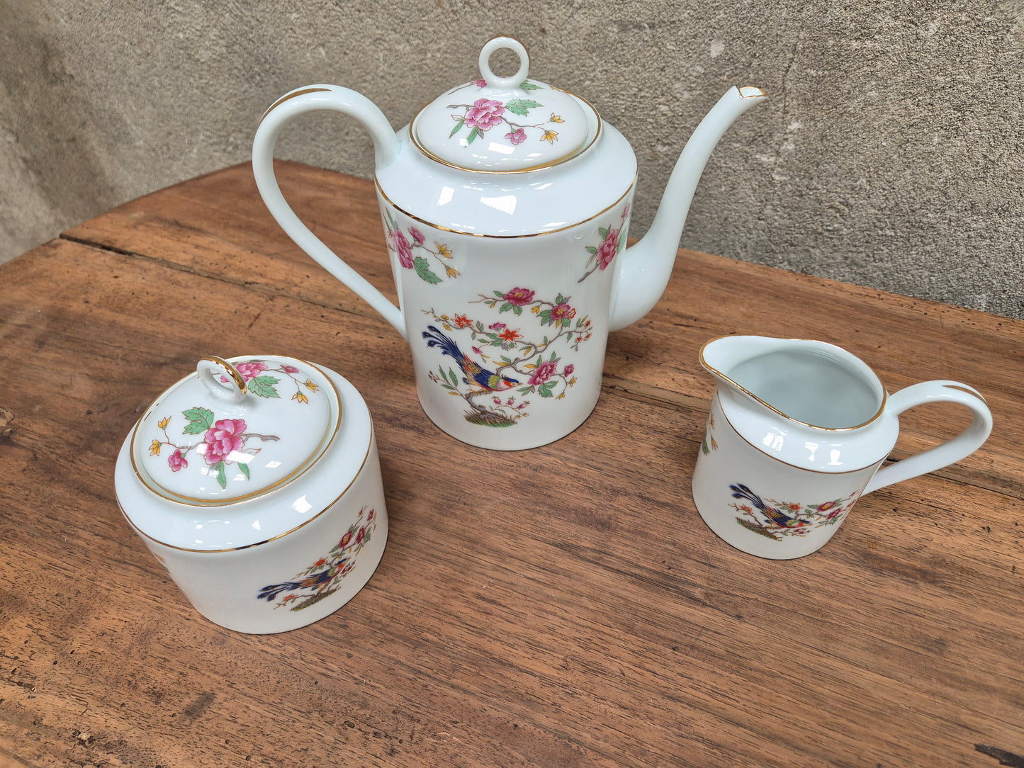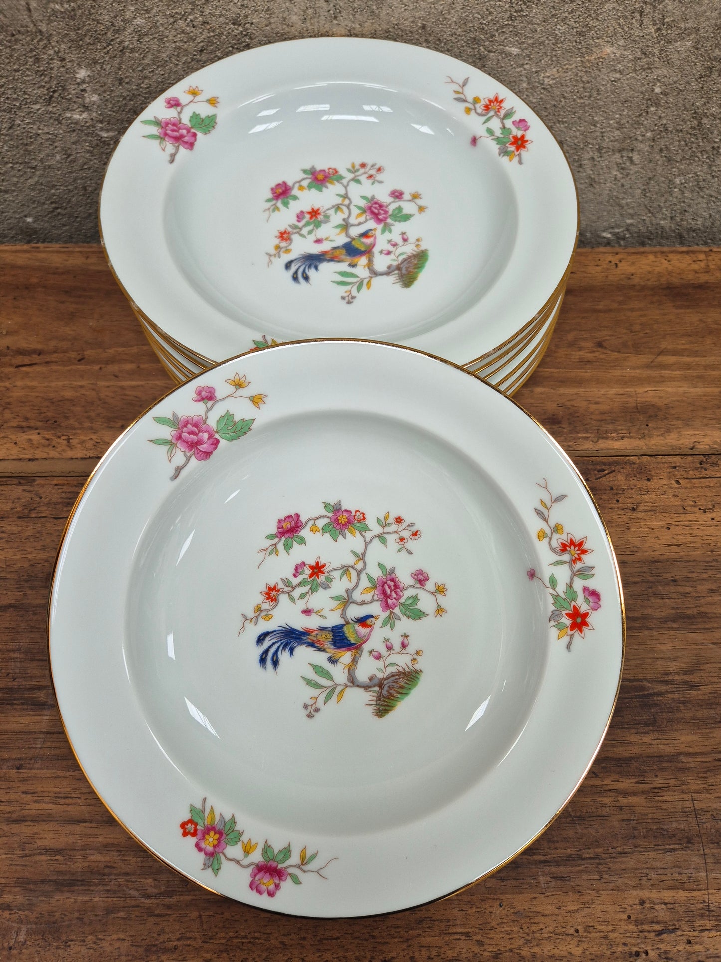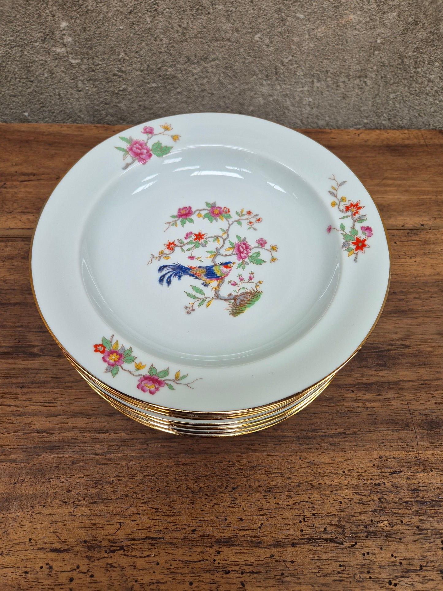 Service de table en porcelaine de Limoges avec un décor fleuri, oiseau bleu et liseré doré.