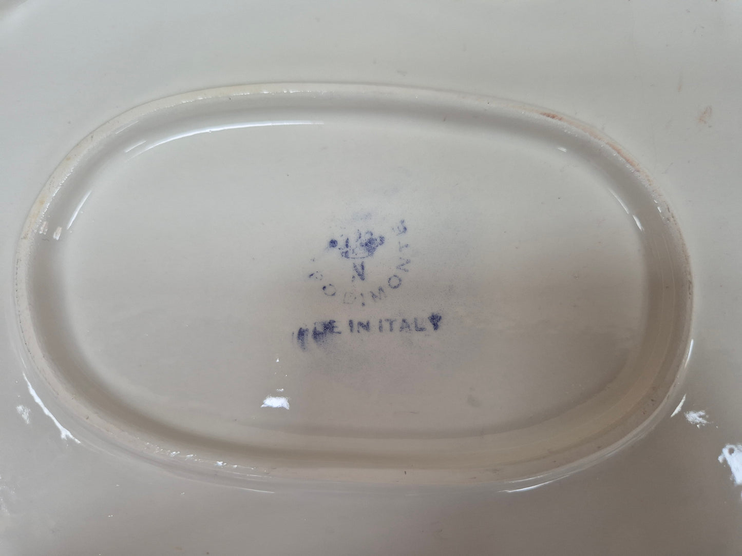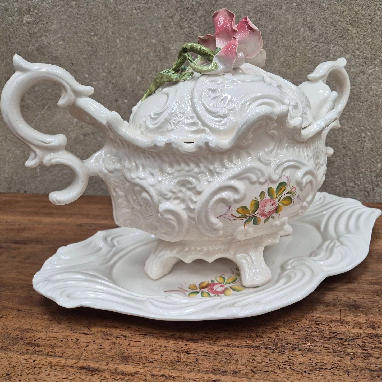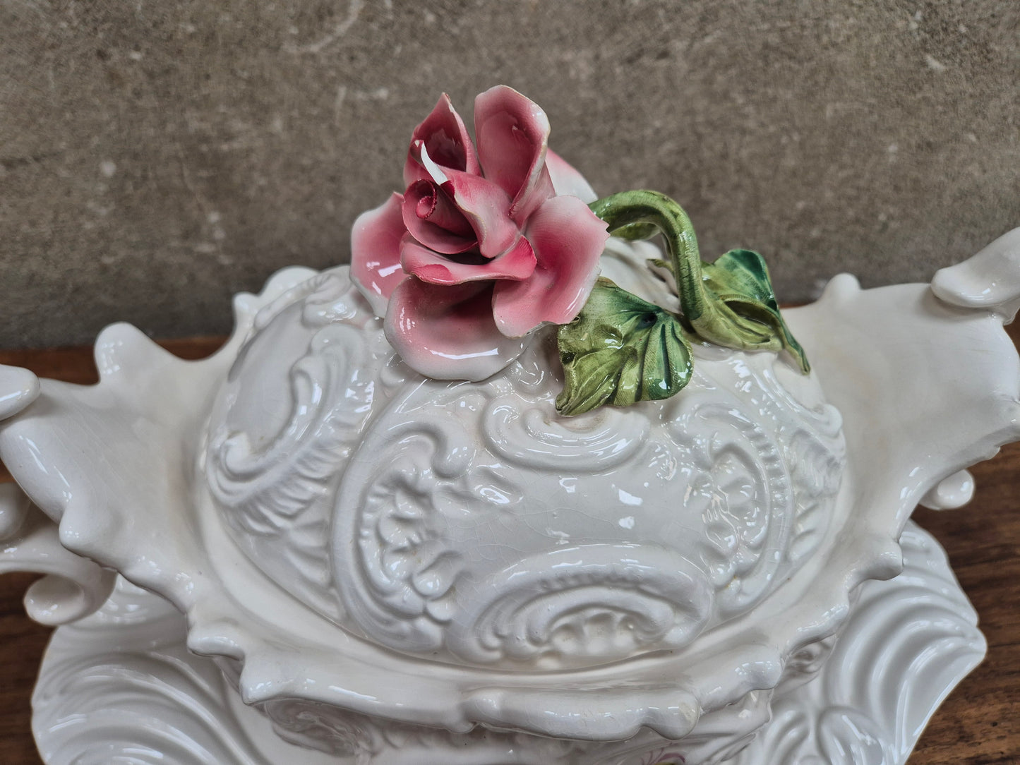 Soupière décorative de la maison "CAPODIMONTE" en Italie. Avec une belle rose sur le dessus de la soupière et un décor peint sur le côté. Fournie avec son plateau.