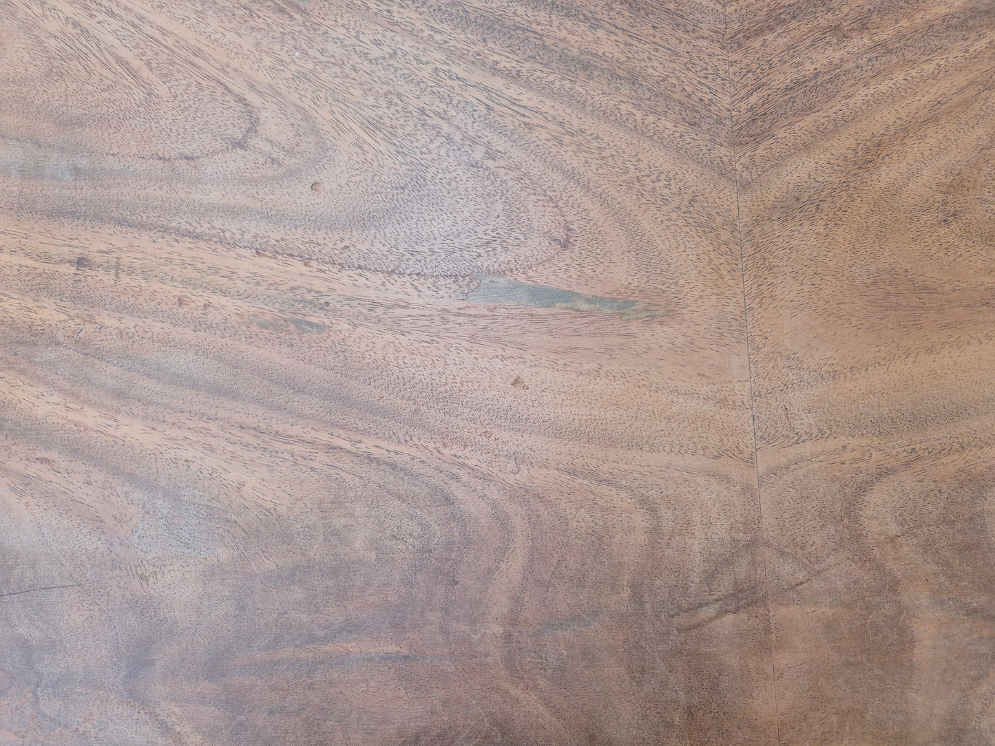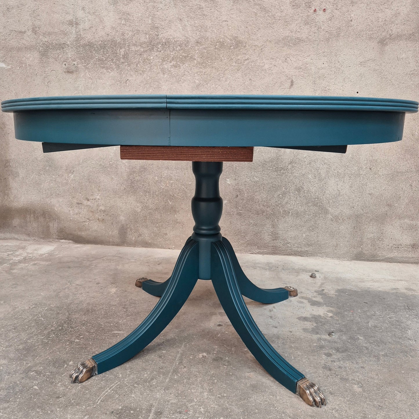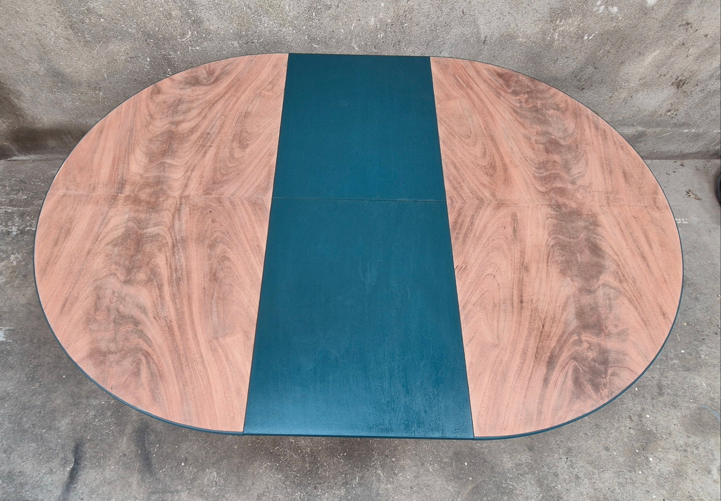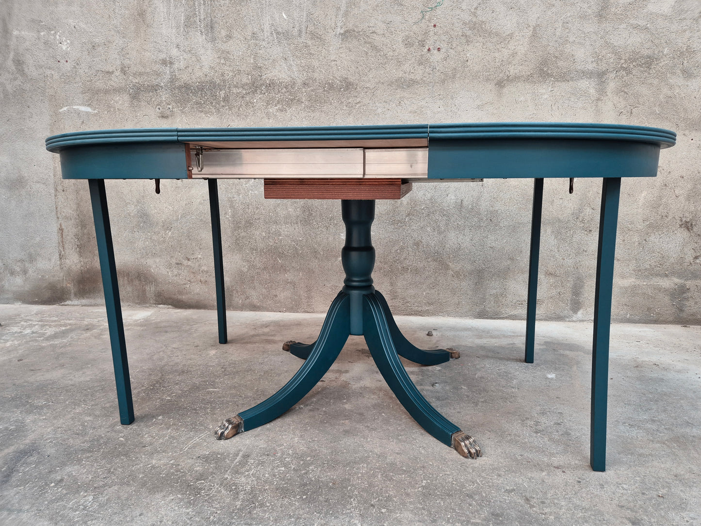 Table anglaise avec plaquage et finition sur les pieds. Fournie avec sa rallonge.