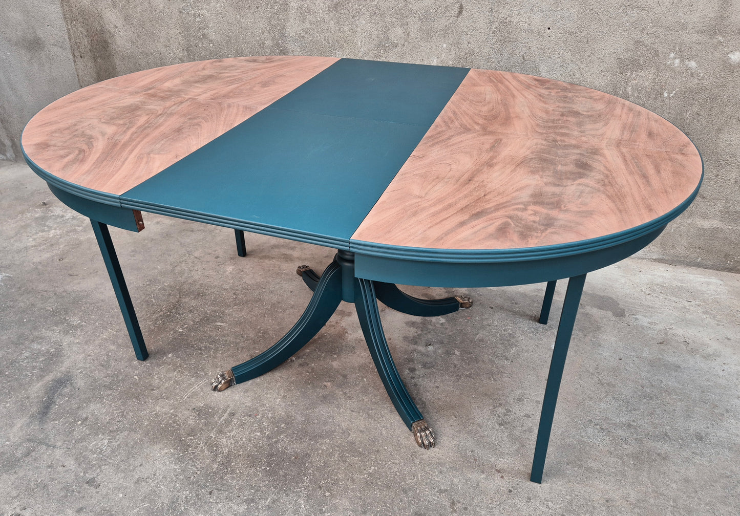 Relookée avec soins. Décapée, traitée, peinte et vernie sur le plateau principal. Pose de la cire sur la rallonge pour une mise en valeur unique.