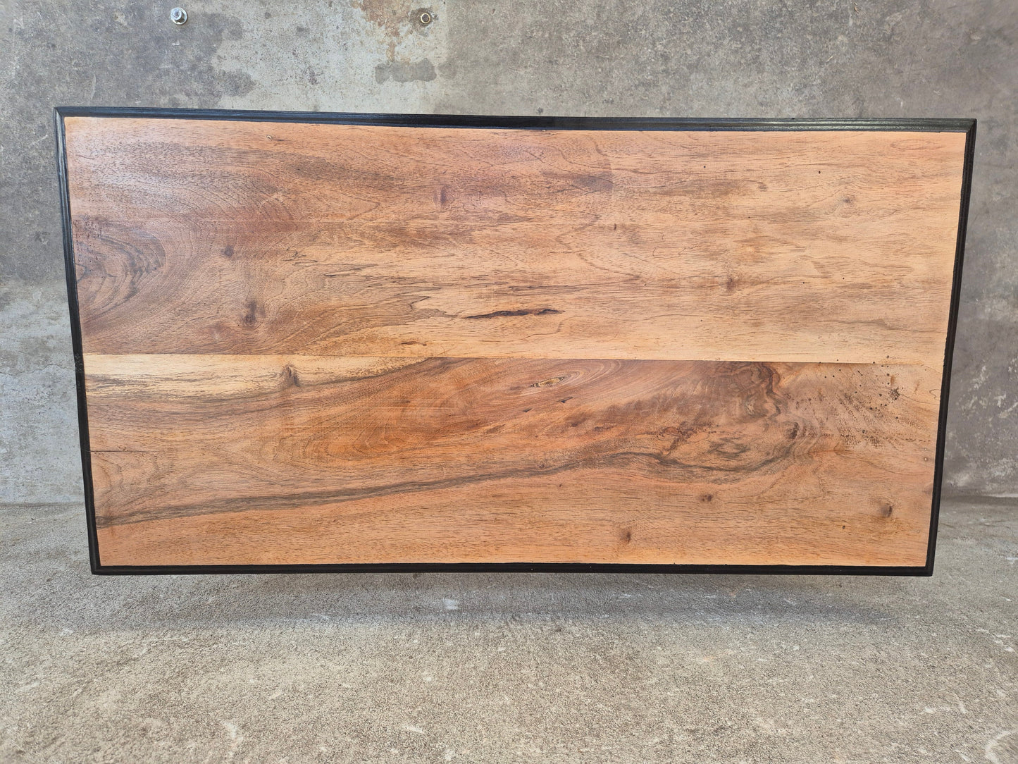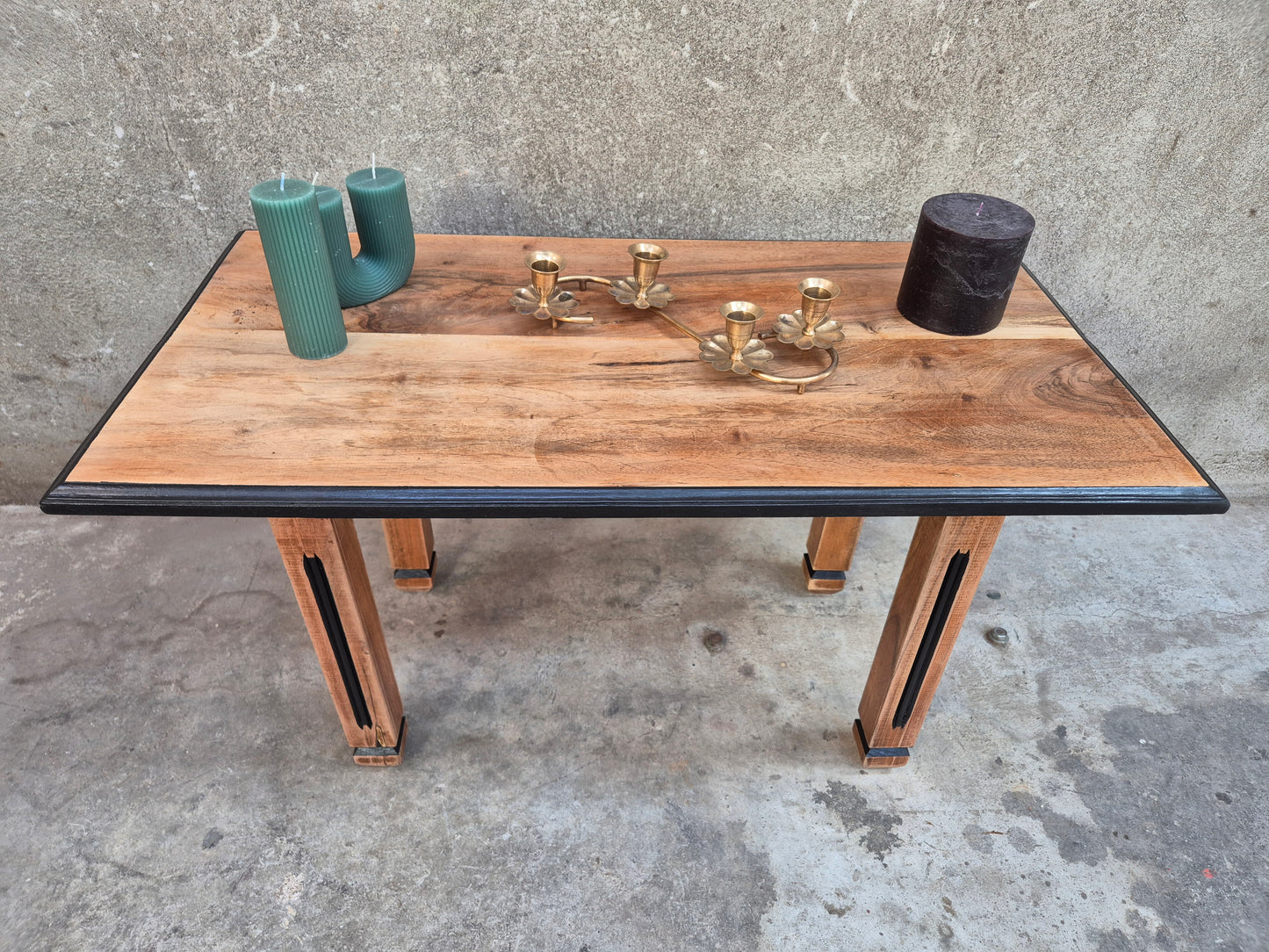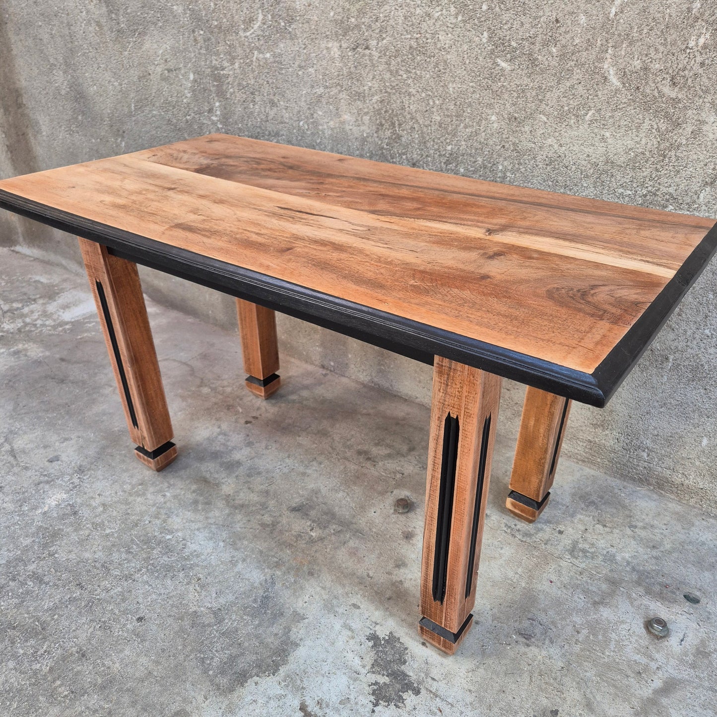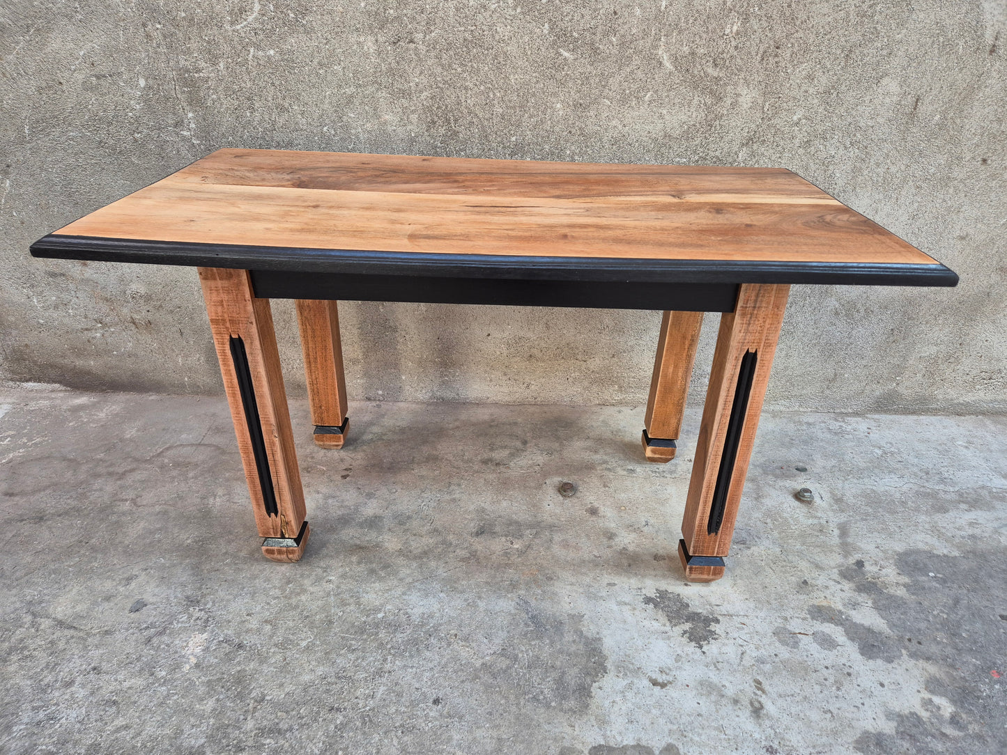 Poncée, traitée, peinte en noir sur les pieds et le dessous du plateau. Ensemble protégé par du vernis.