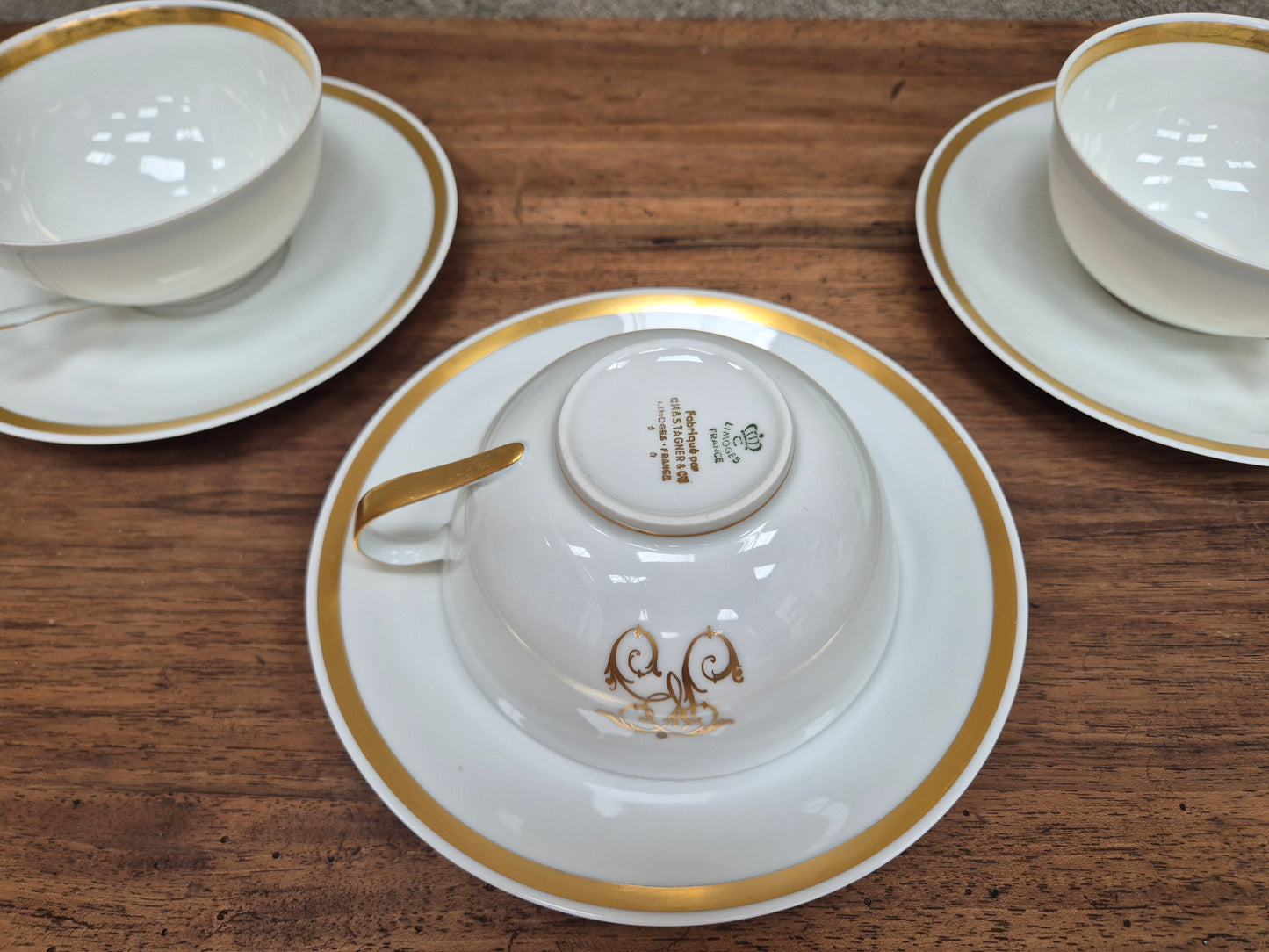 Lot de trois grandes tasses (petit bol) et sous tasses en porcelaine de Limoges fabriqué par Chastaigner.