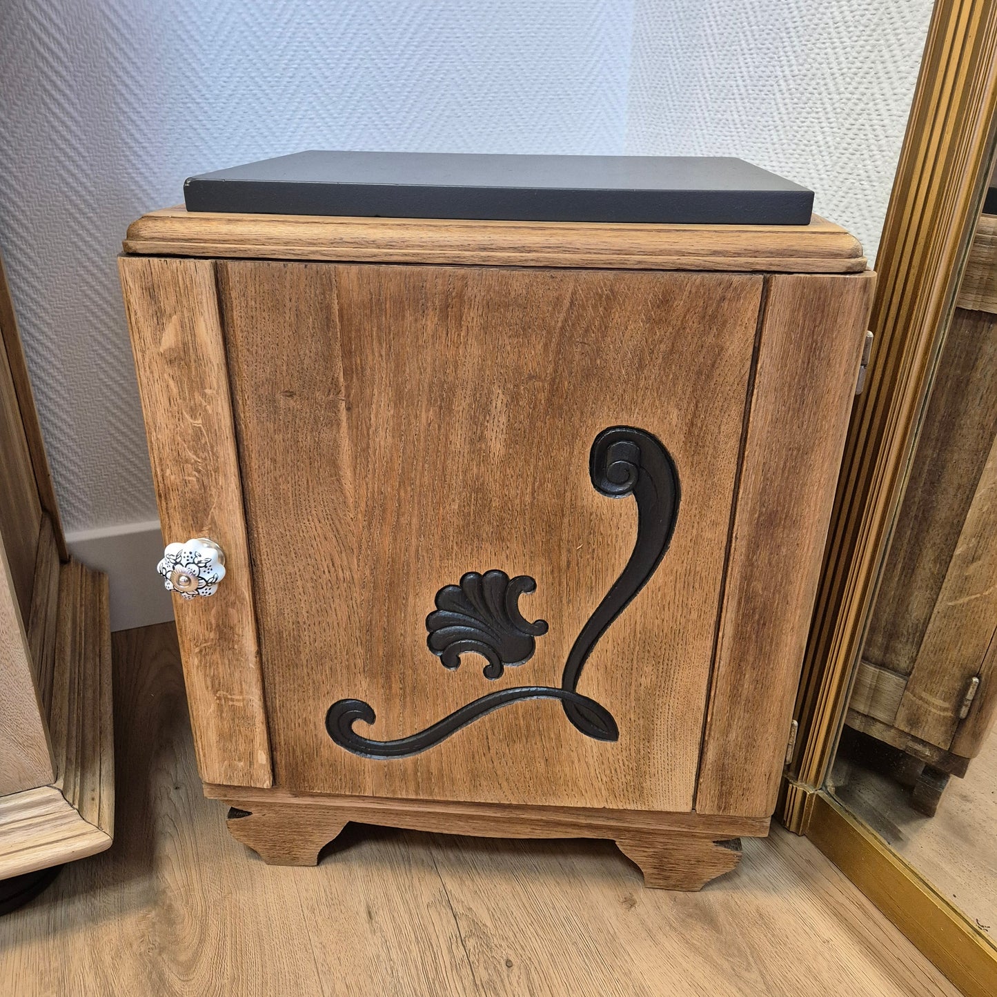 Entièrement restauré et relooké. Poncé, le marbre du dessus est repeint en noir et le meuble protégé par de l'huile protection incolore.