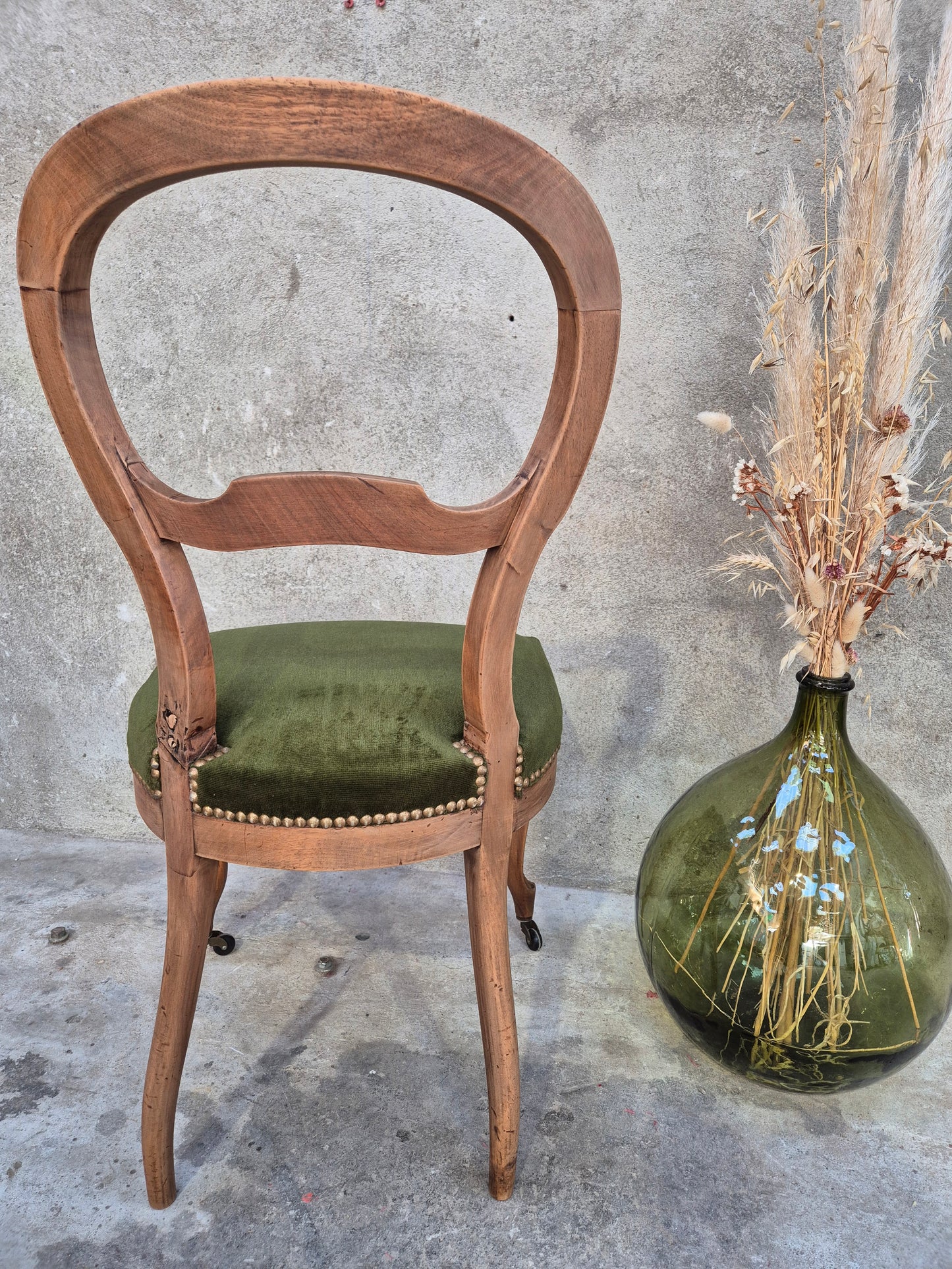 Chaise Louis Philippe en velours vert. Original avec les roulettes sur le devant.