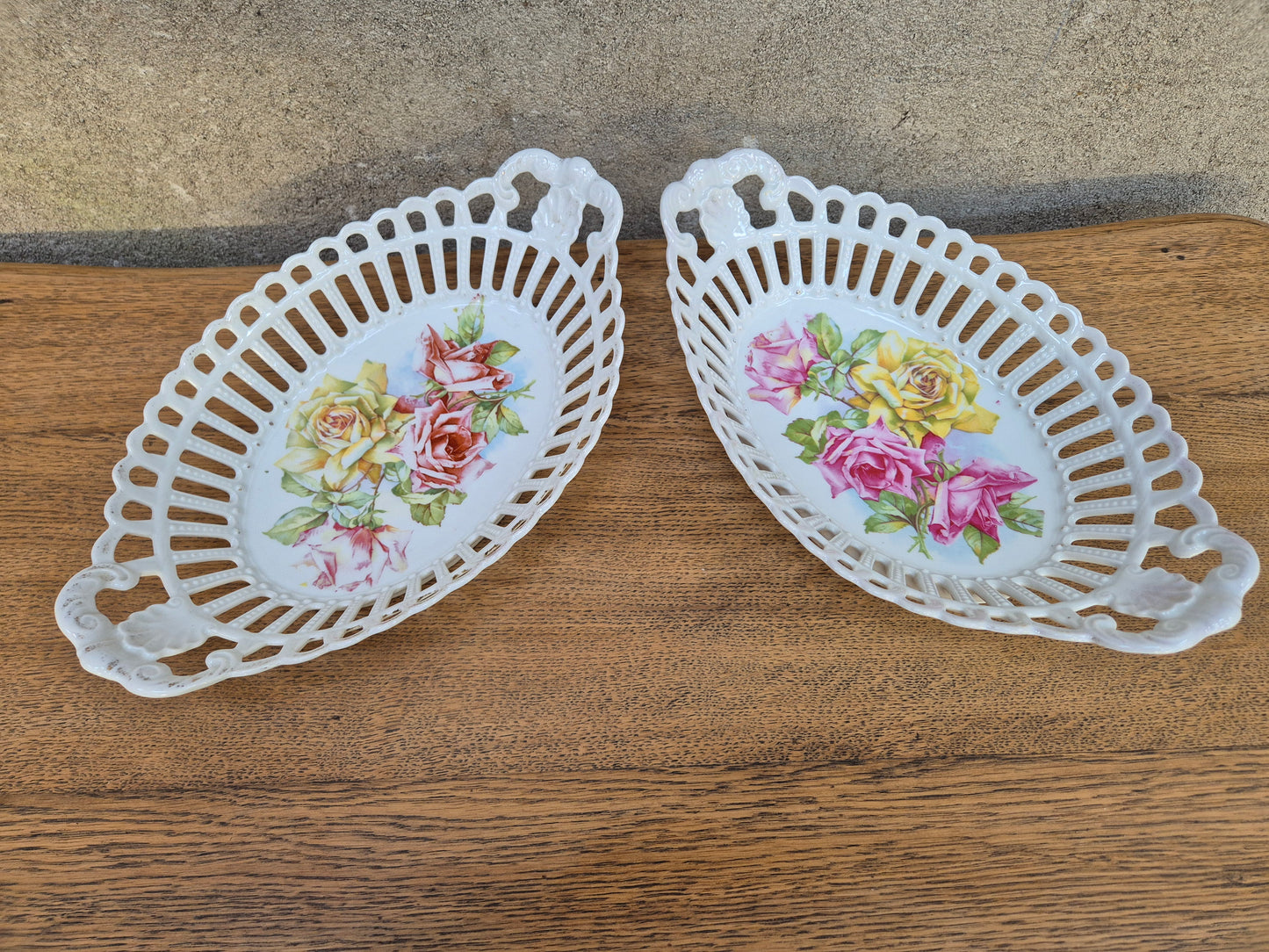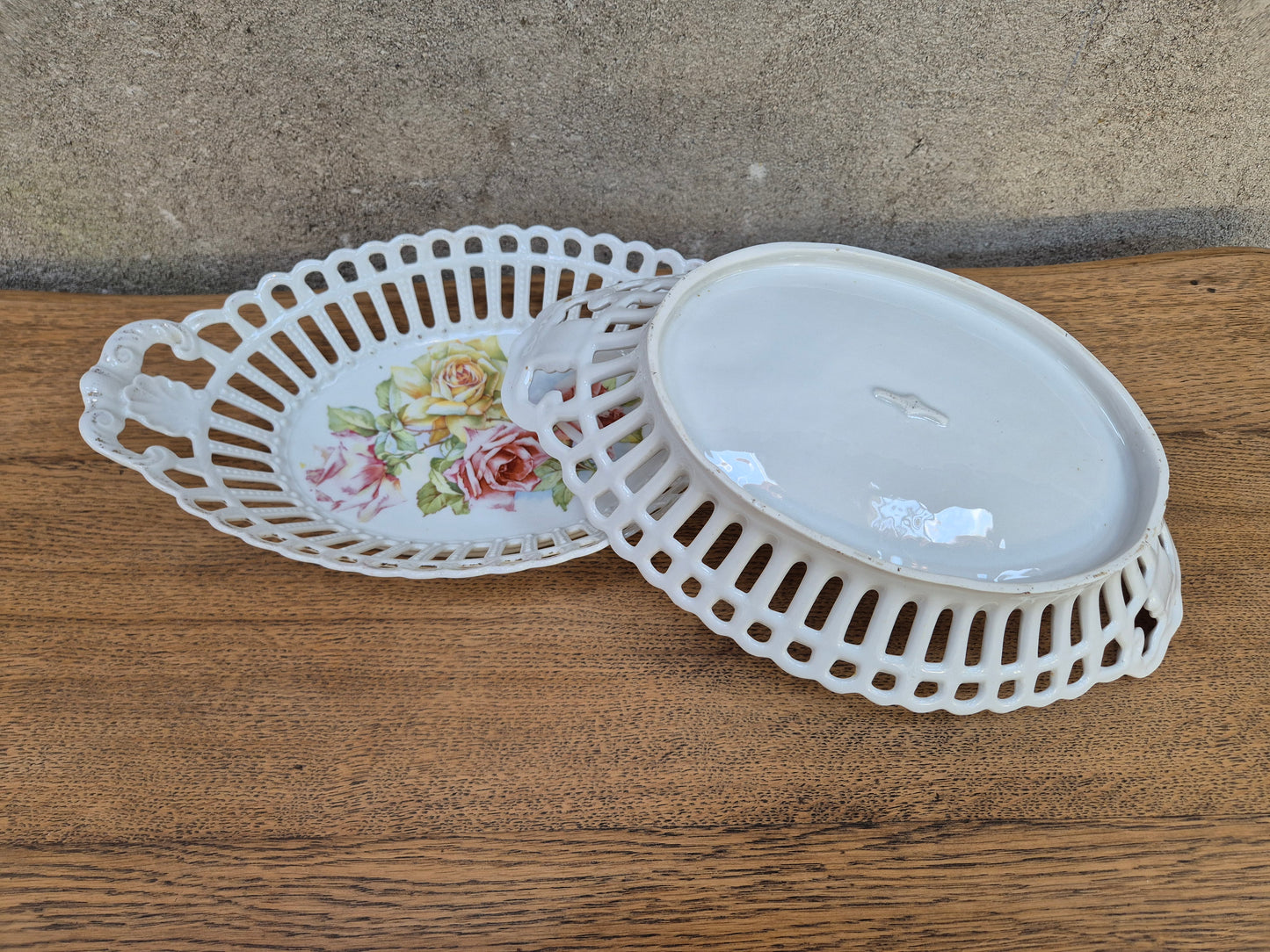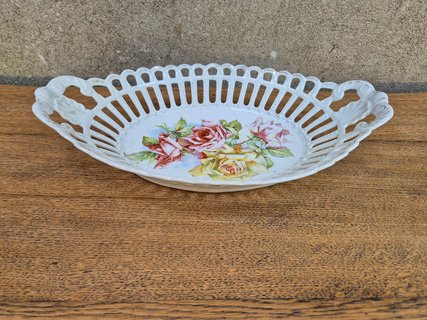 Coupe à fruits en porcelaine ajourée avec décor de rose.
