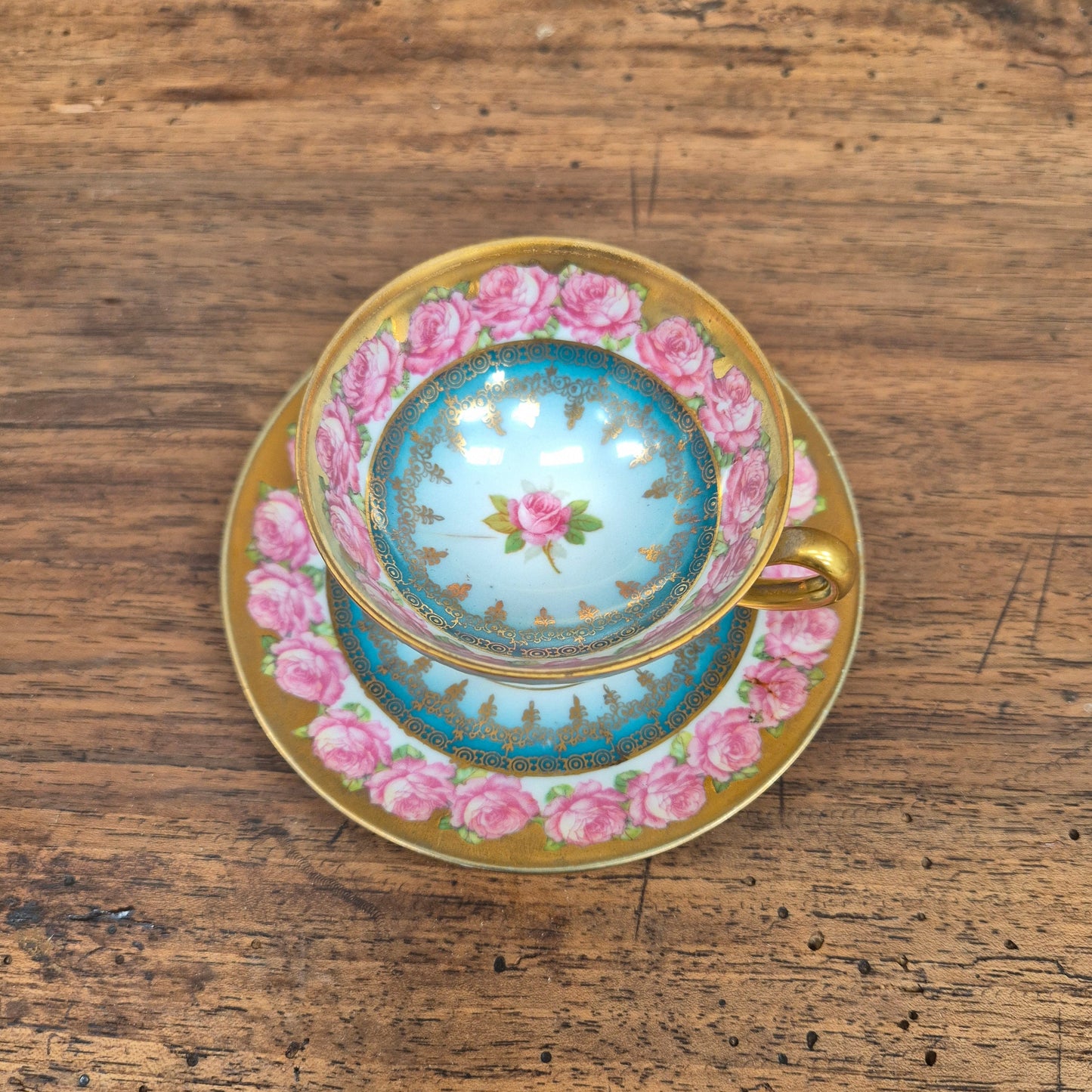 Quatre tasses et soucoupes à décor de bouton de rose, liseré doré et fond bleu dans les tasses et soucoupes.