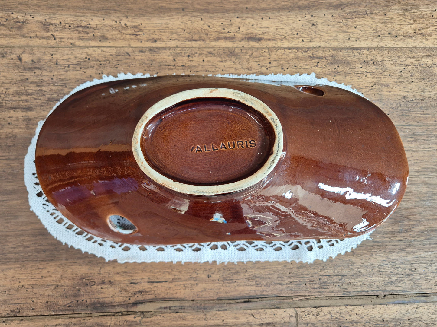 Coupe à fruit en céramique "Vallauris" multicolore sur fond marron.