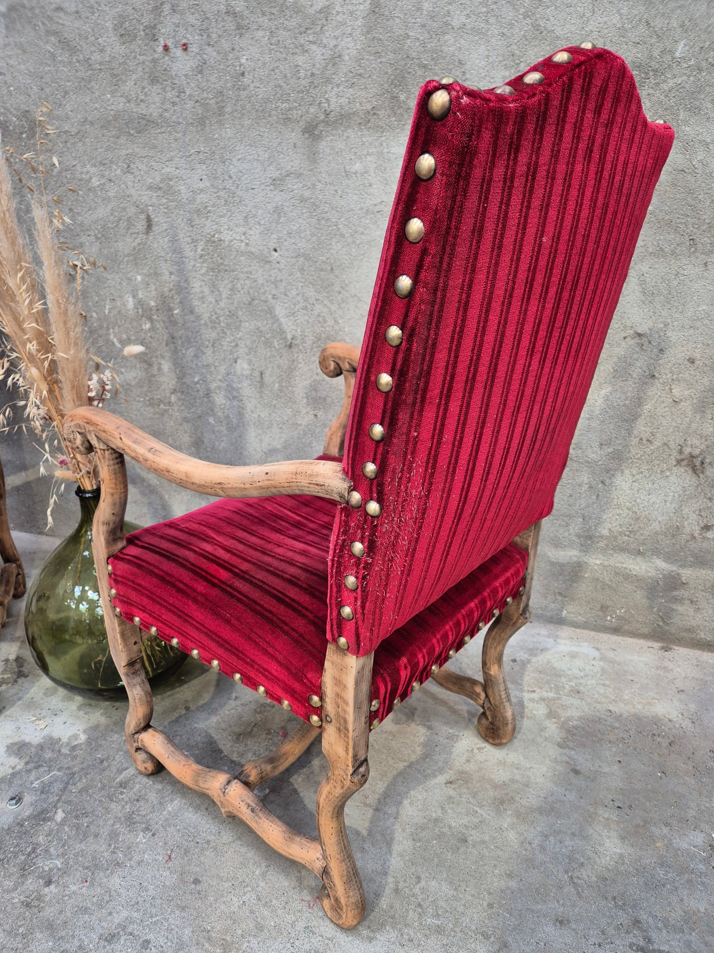 Paire de fauteuils en velours rouge Louis XIII, os de mouton pour la forme du bois.