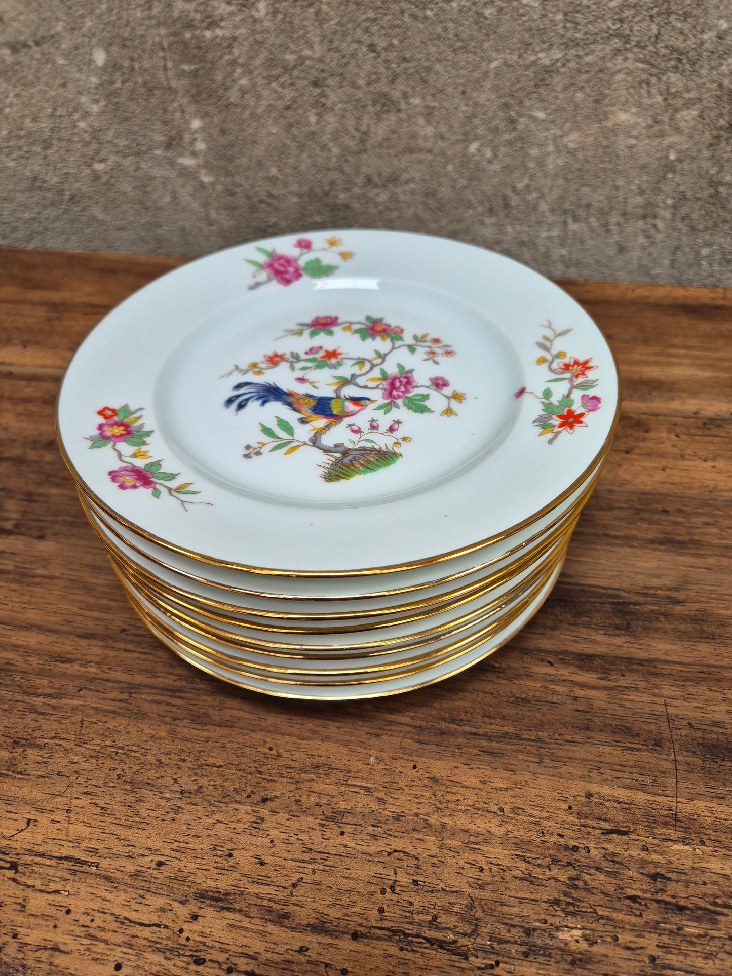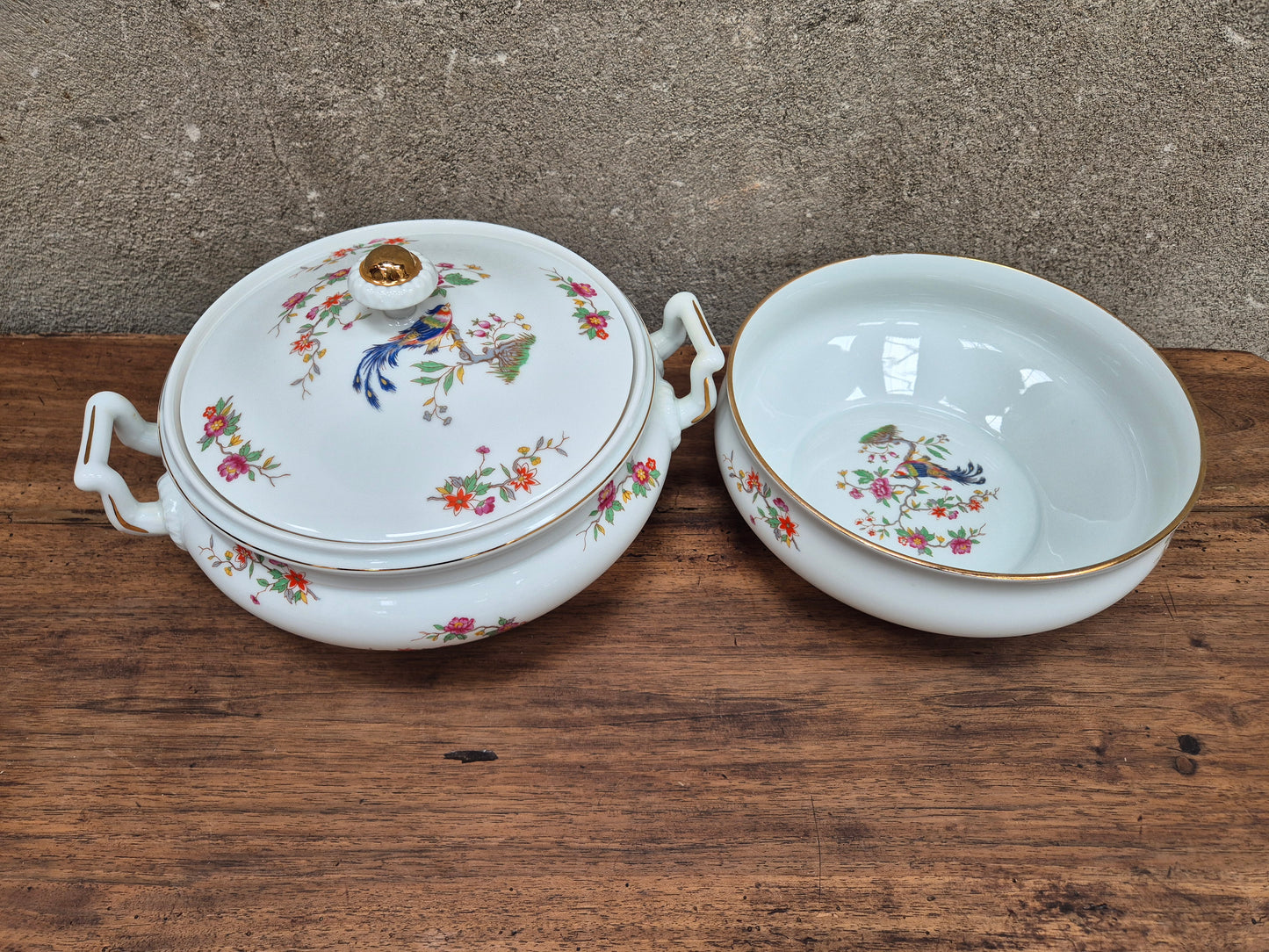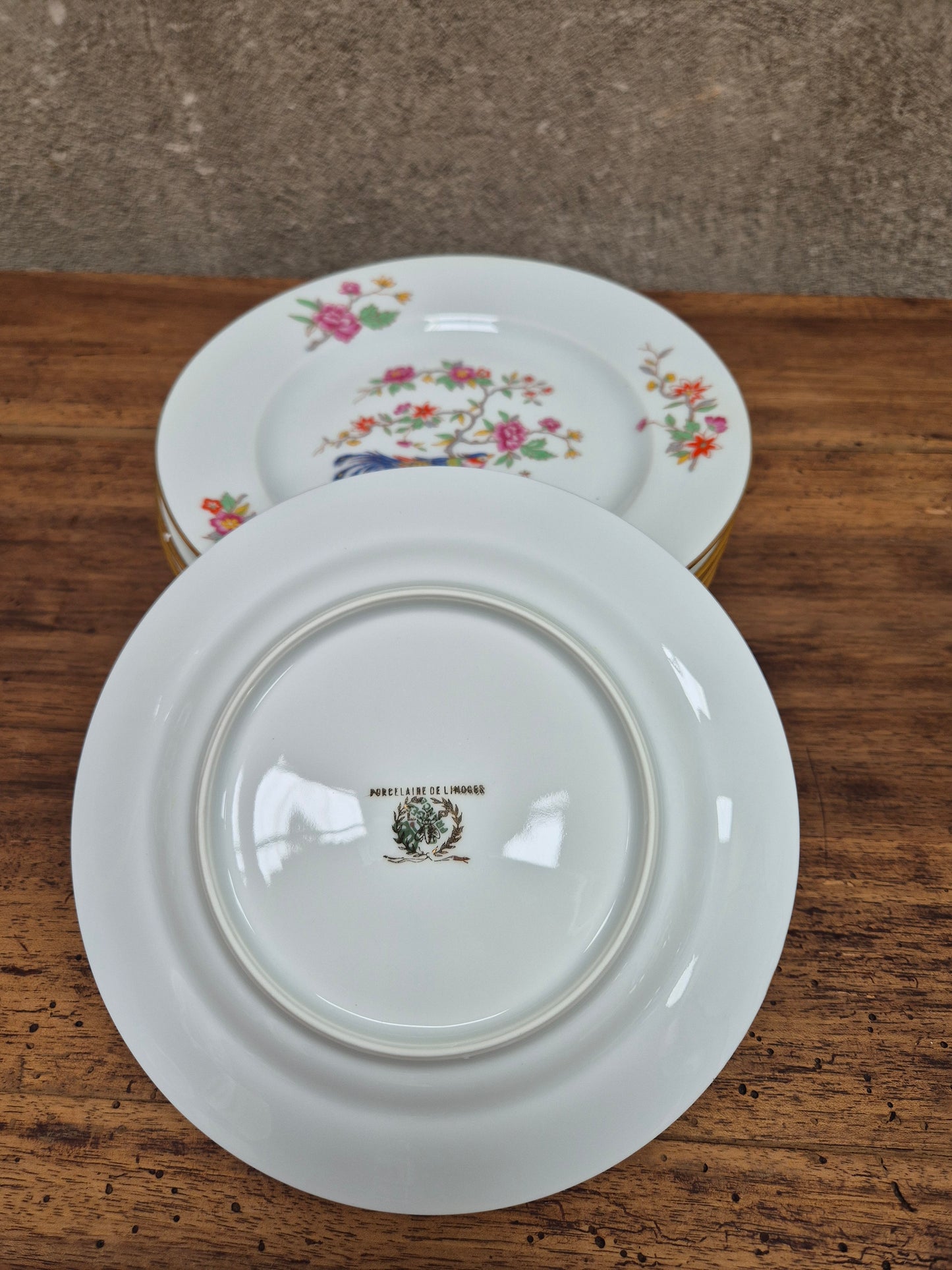 Service de table en porcelaine de Limoges avec un décor fleuri, oiseau bleu et liseré doré.
