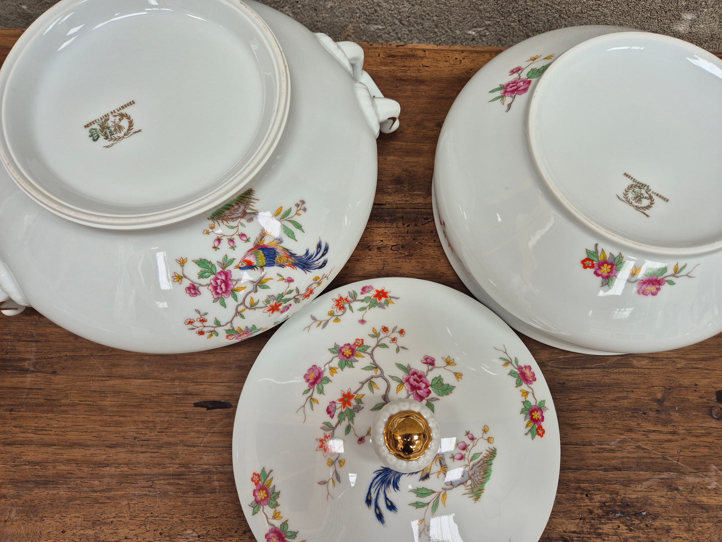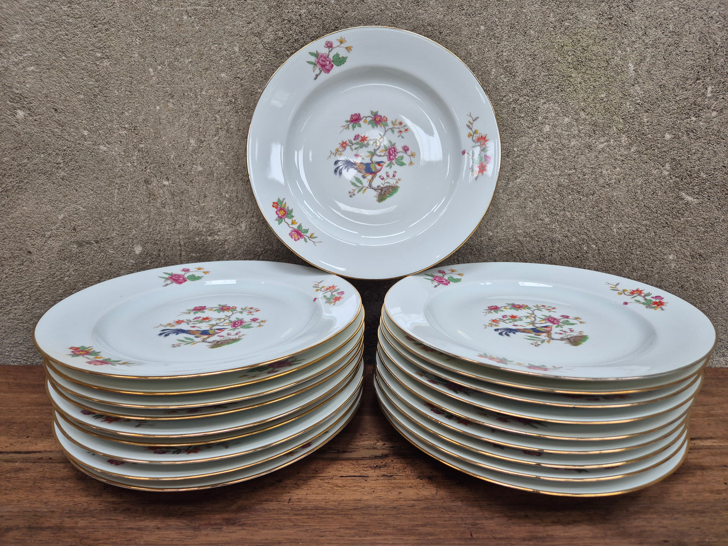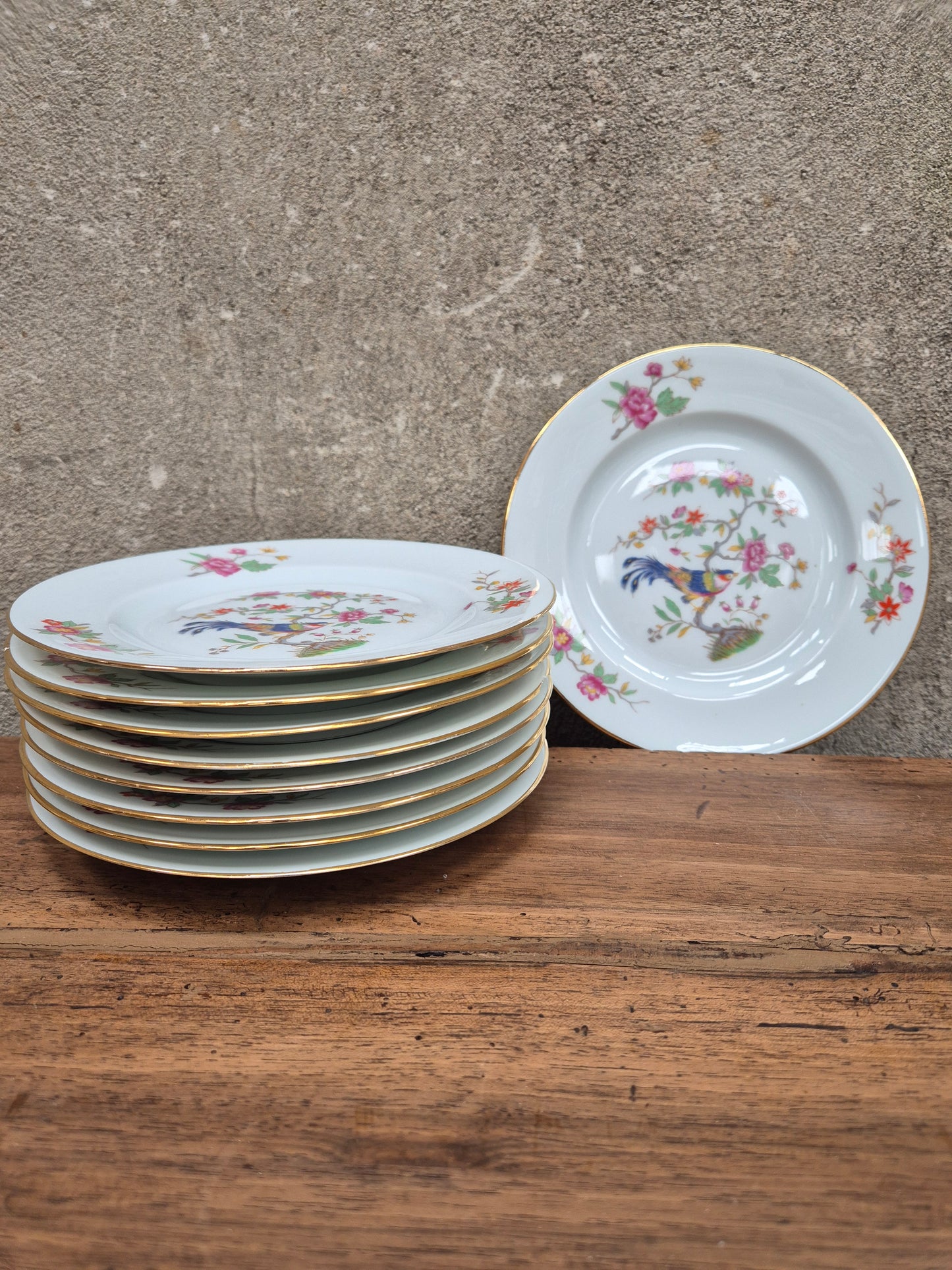 Service de table en porcelaine de Limoges avec un décor fleuri, oiseau bleu et liseré doré.