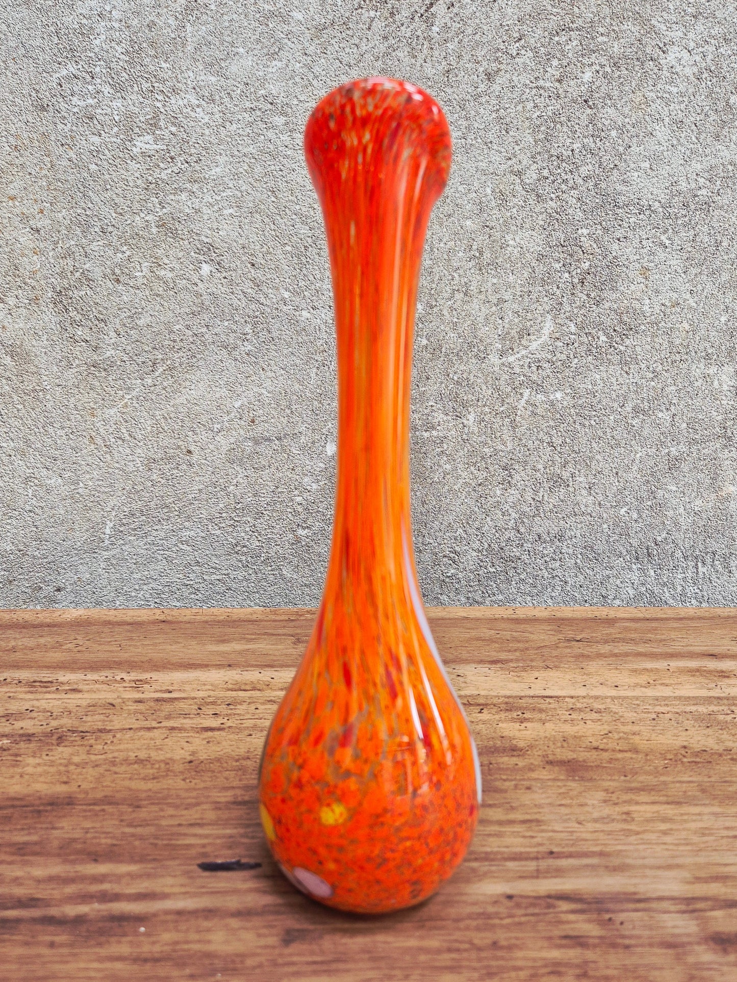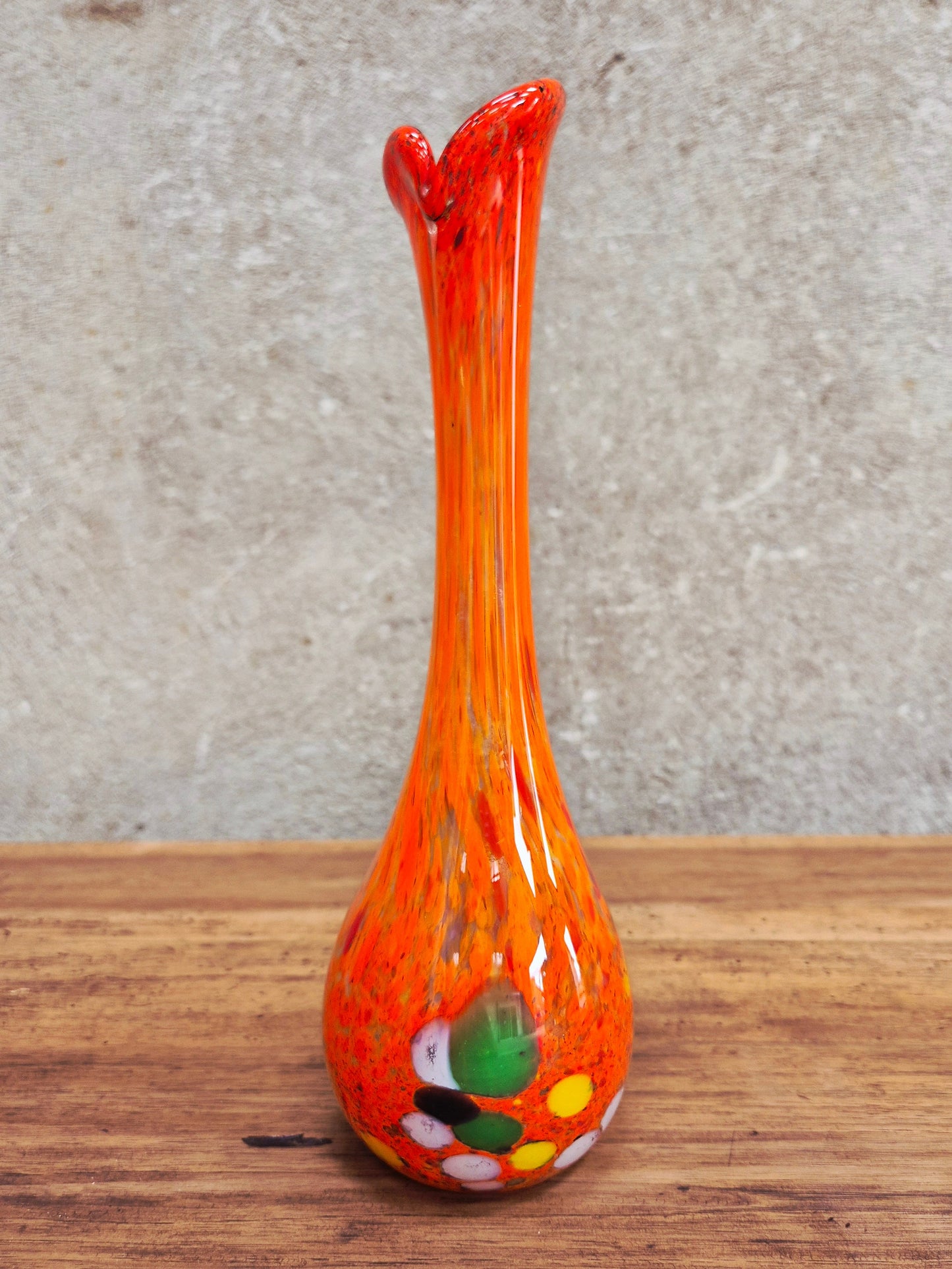 Vase soliflore en verre à décor orange et multicolore. Style vintage.